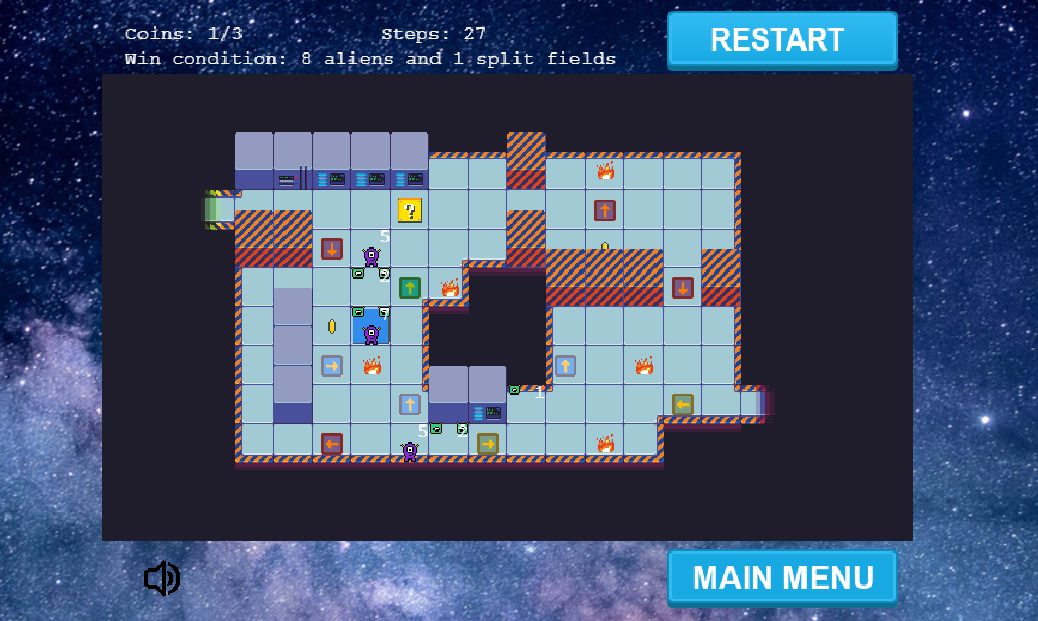 A little dungeon crawler game, inspired by a crowd evacuation simulator that was also based on the Markov Decision Process. The fields represent different states that the player can switch to. The probability is implemented by a logic that splits the alien groups depending on which action field youre standing on. Action fields are marked with icons that have arrows inside. The goal is to reach the exit with as many aliens as possible and within the limit of movements. Mind the flames when striving through the field.