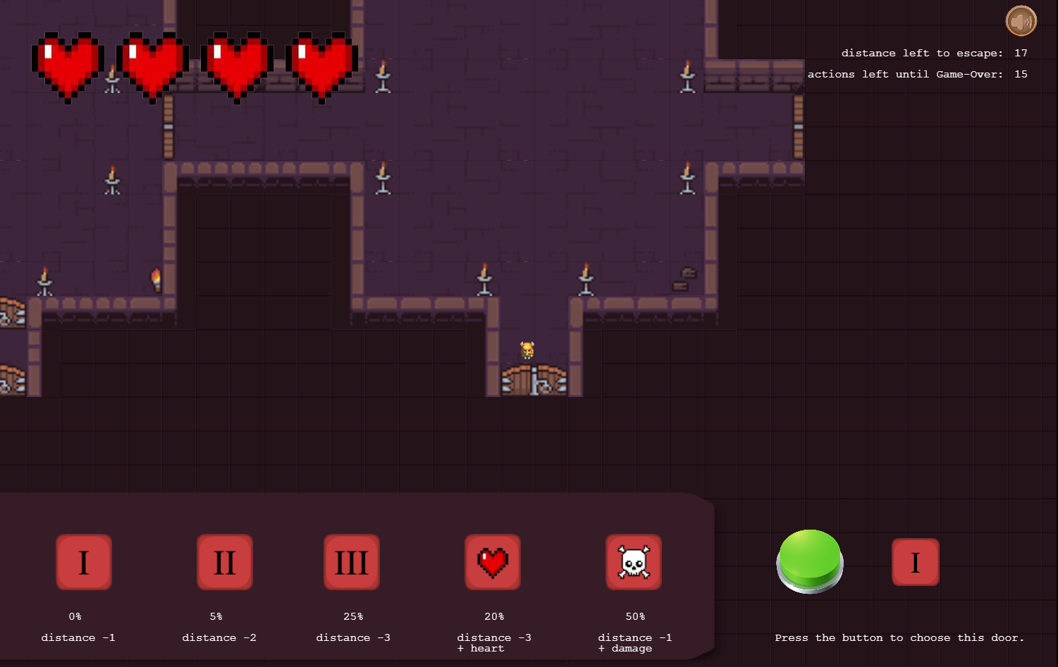 A dungeon crawler based on markov decision processes. Rooms represent states and opening doors represent state changes. What’s behind the door depends on what magic 5-sided die you chose and what event occurs. All dice have the same sides but different probabilities. Some events get you farther than others, some hurt you! Escape before you’re out of moves!